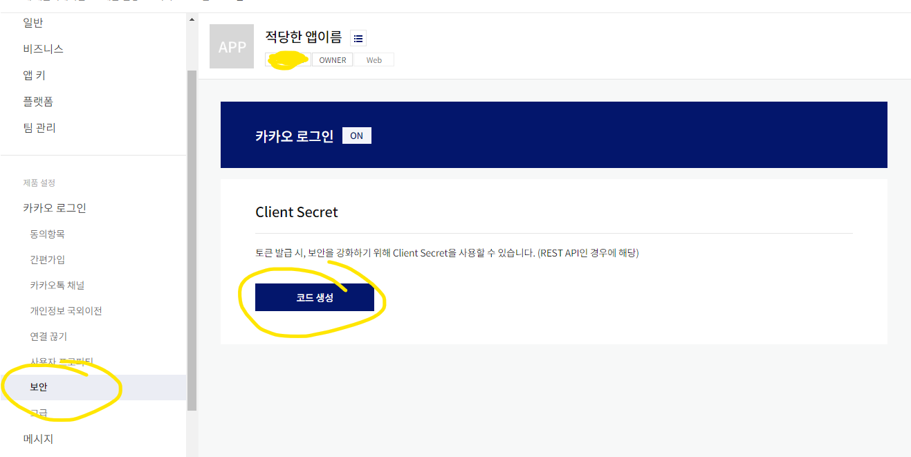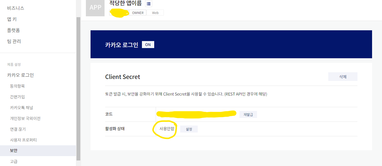 5. 보안 코드 생성(생성만 하고 사용안함으로 설정해두기)