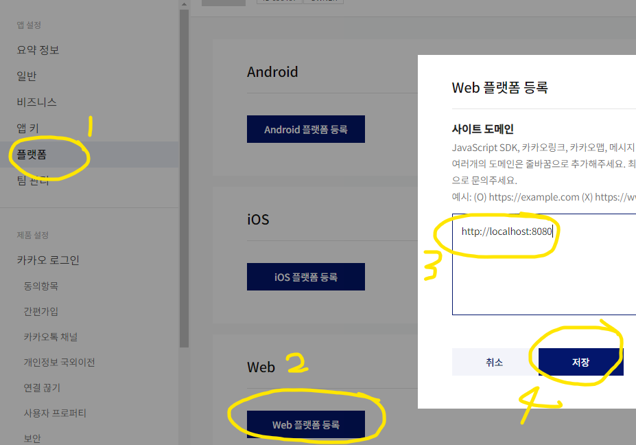 2. Web 플랫폼 등록(자신의 공인아이피 또는 localhost:port 입력)