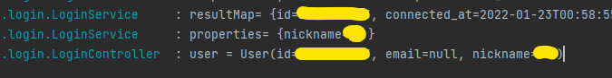 로그를 통해 유저 정보가 User 객체에 잘 들어와 있음을 확인할 수 있습니다.