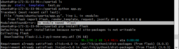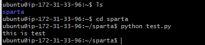 test.py가 있는 sparta폴더로 이동해서 python 명령어를 통해 test.py를 실행시켰다.