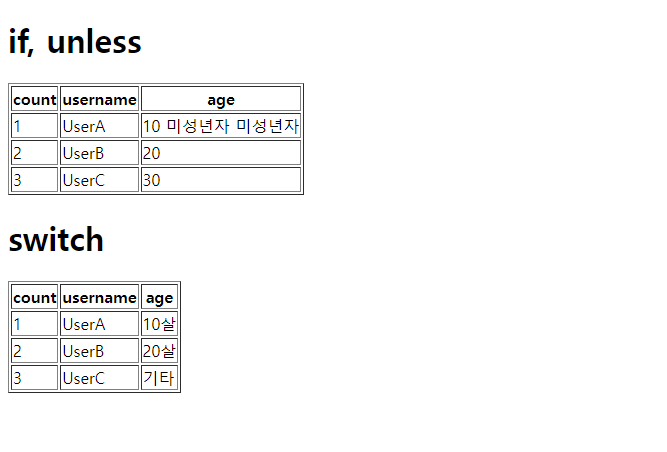 <span th:text="'미성년자'" th:unless="${user.age ge 20}"></span>