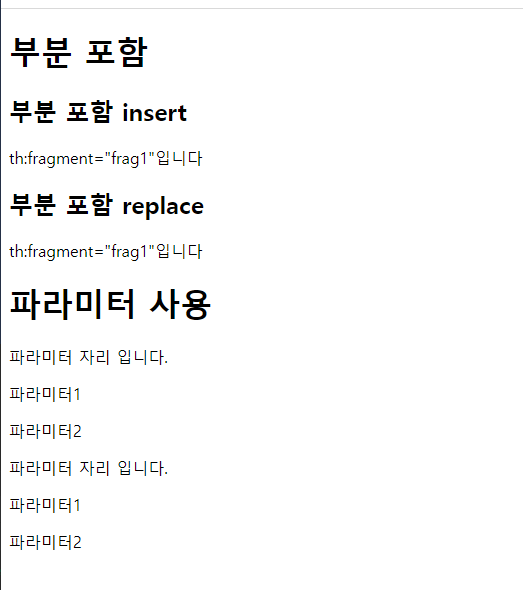 <footer th:fragment="fragParam (param1,param2)"> //()를 이용해 조각에 파라미터 부여 가능