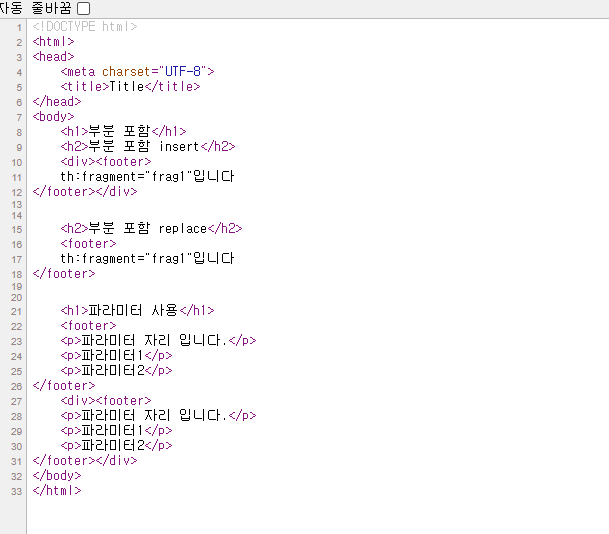 <footer th:fragment="frag1"> //th:fragment 있으면 불려나가는 조각임