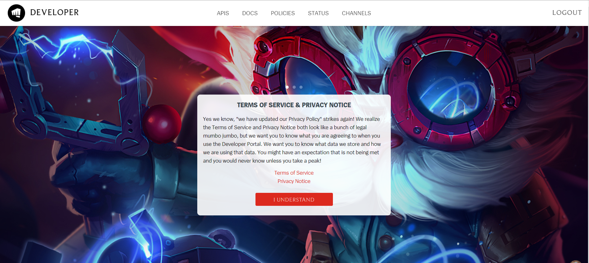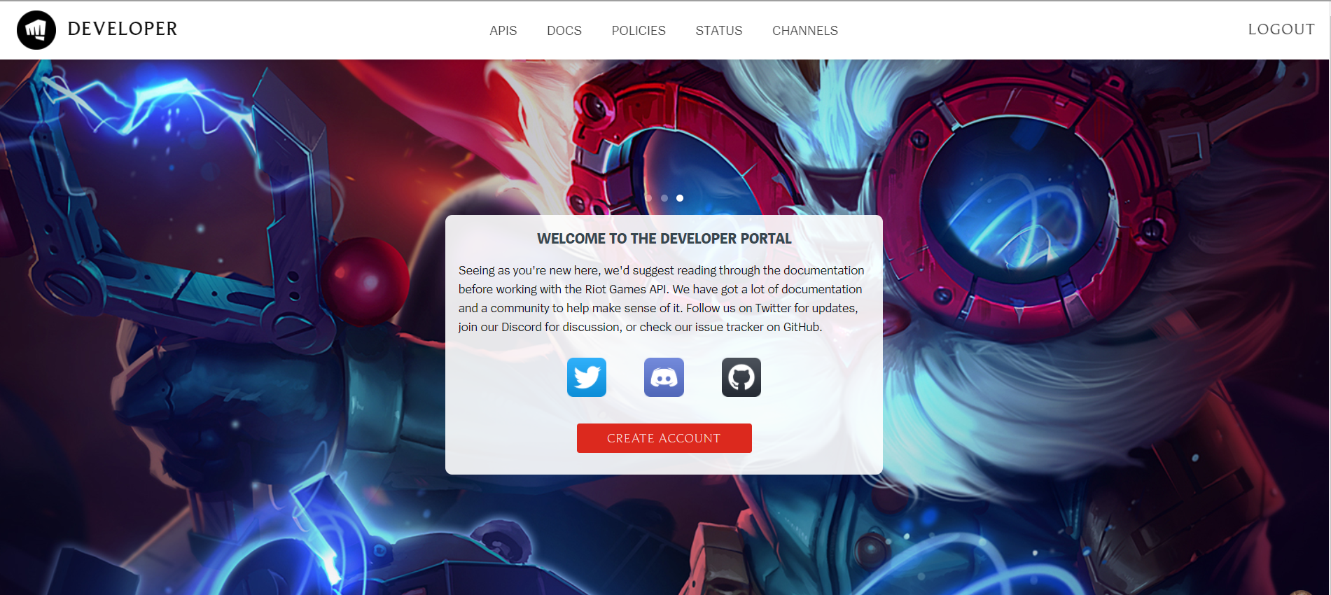 위 사이트에서 Riot API의 사용권한을 얻을 수 있다. 한글을 찾아볼 수 없는 화면에 마음이 착찹해질 수 있지만 간단하다.