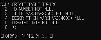 CREATE TABLE TOPIC( ID NUMBER NOT NULL, TITLE VARCHAR2(50) NOT NULL, DESCRIPTION VARCHAR2(4000), CREATED DATE NOT NULL, CONSTRAINT PK_TOPIC PRIMARY KEY(ID) #ID를 기준으로 PRIMARYKEY PK_TOPIC 만듦 );..